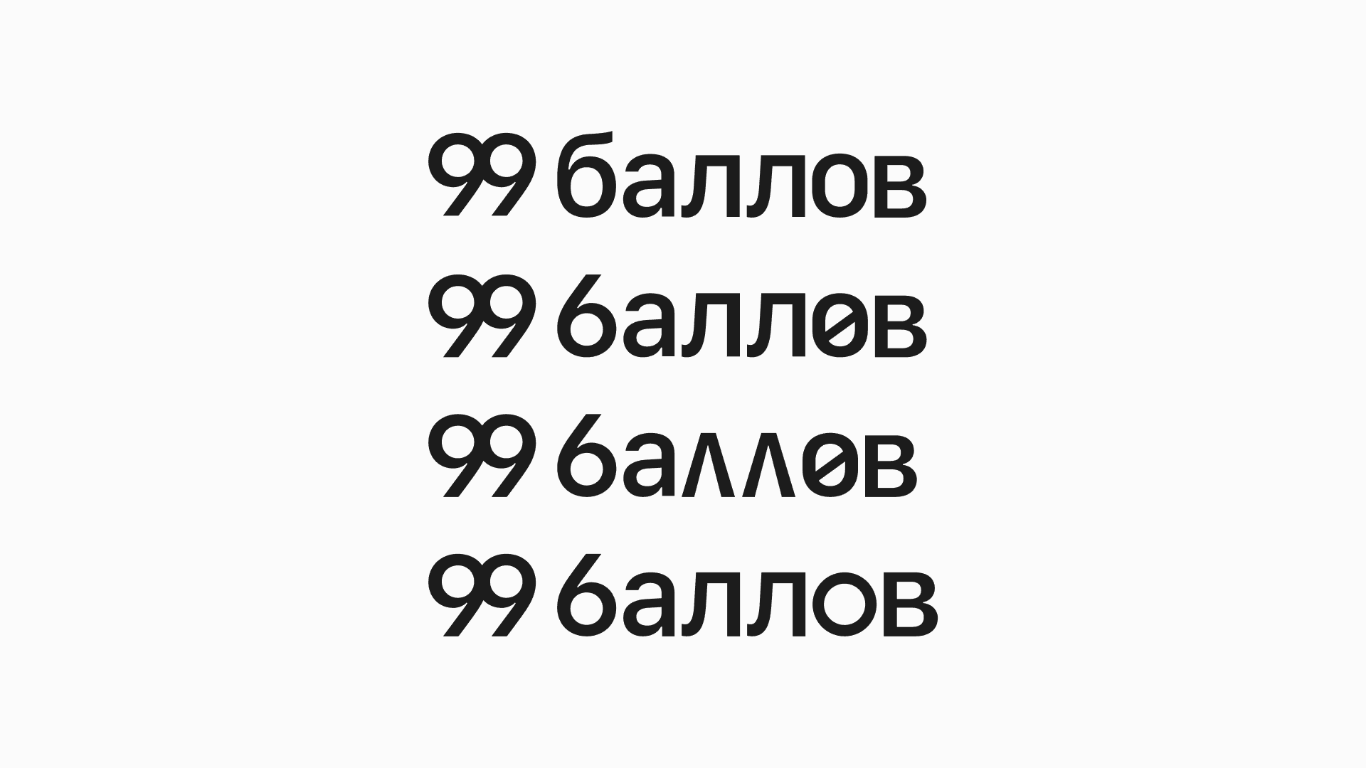 Затем мы принялись составлять композицию логотипа с базовым элементом «99» и словом «баллов».
