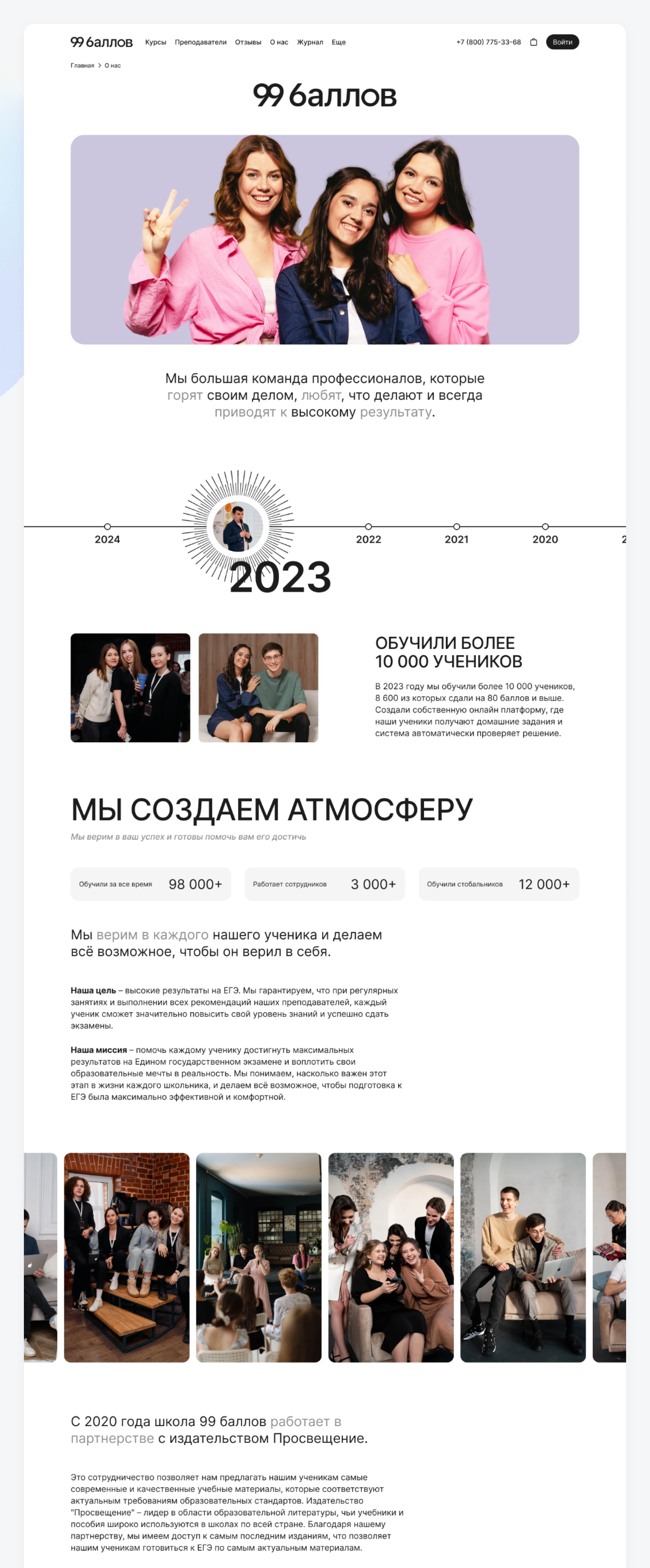 Мы создали уникальный дизайн страницы. Добавили важные фотографии команды и историю по годам. Важно показывать, что школа развивается и двигается вперед.