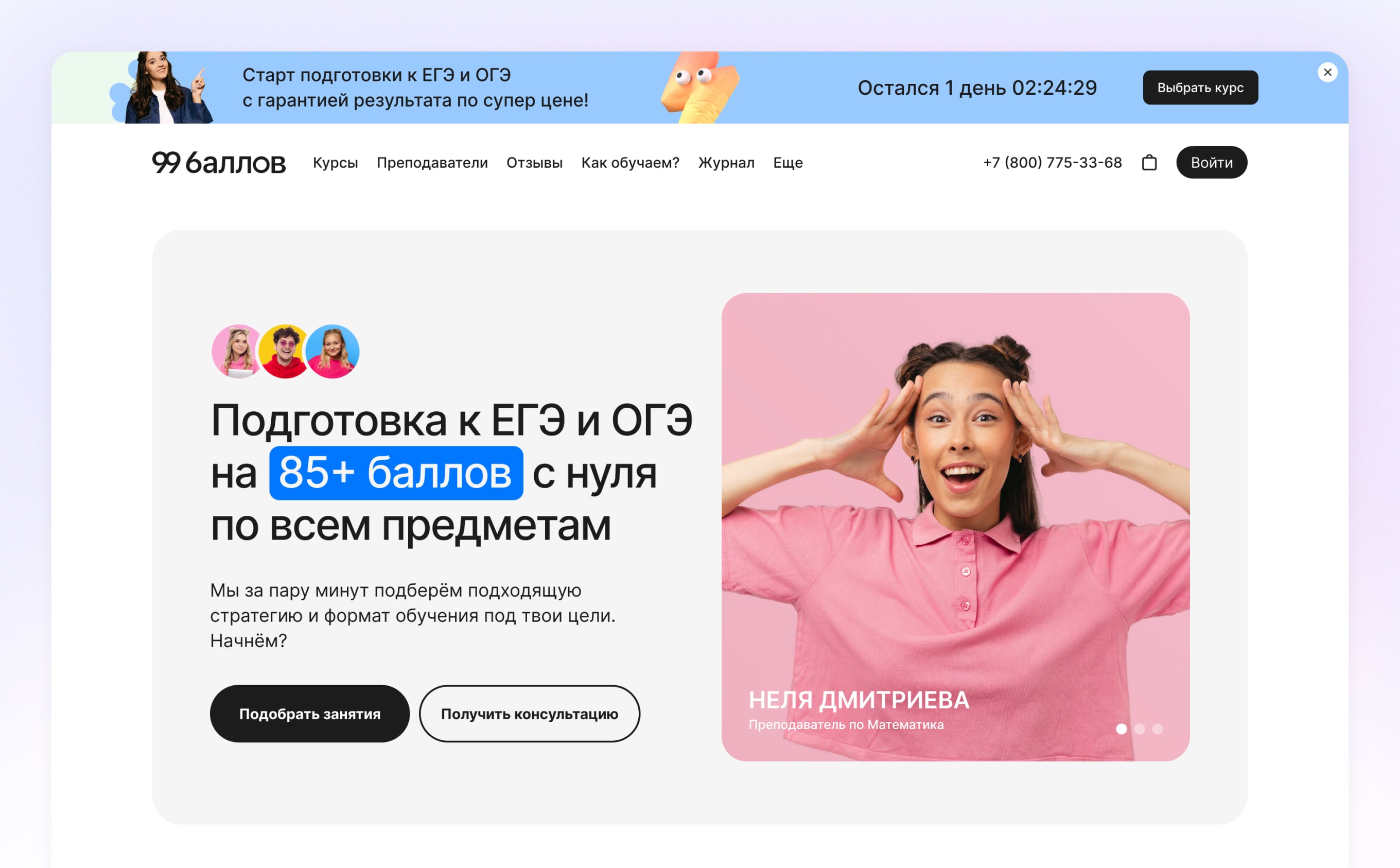 Главная страница сайта – лицо бренда. Важно, чтобы потенциальный клиент с первого взгляда понял, что 99 баллов – это современная школа с инновационным подходом.