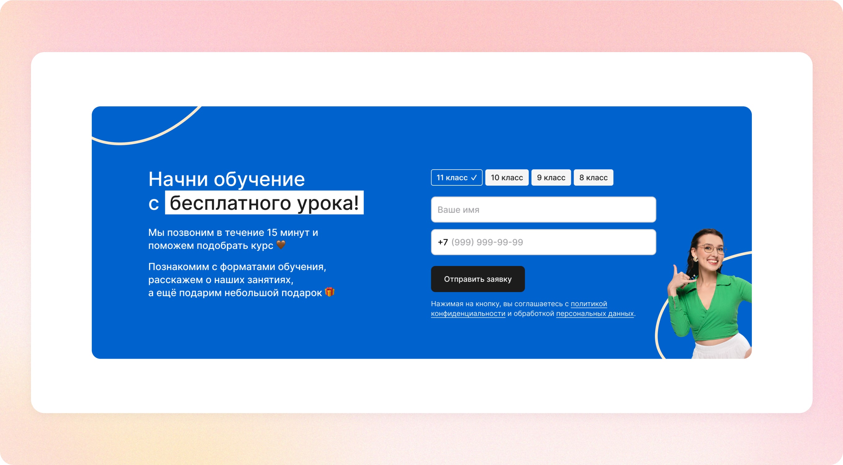 Блок заказа обратного звонка. Выбираем класс, имя и телефон. Далее менеджеры связываются с клиентом и помогают с выбором курса.
