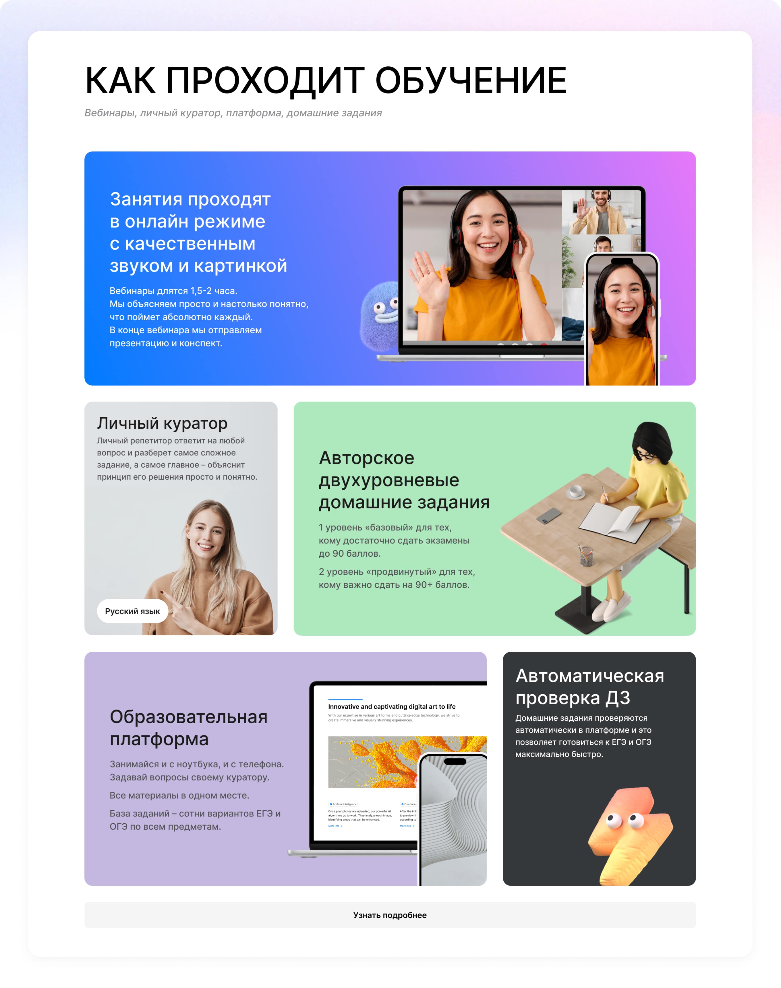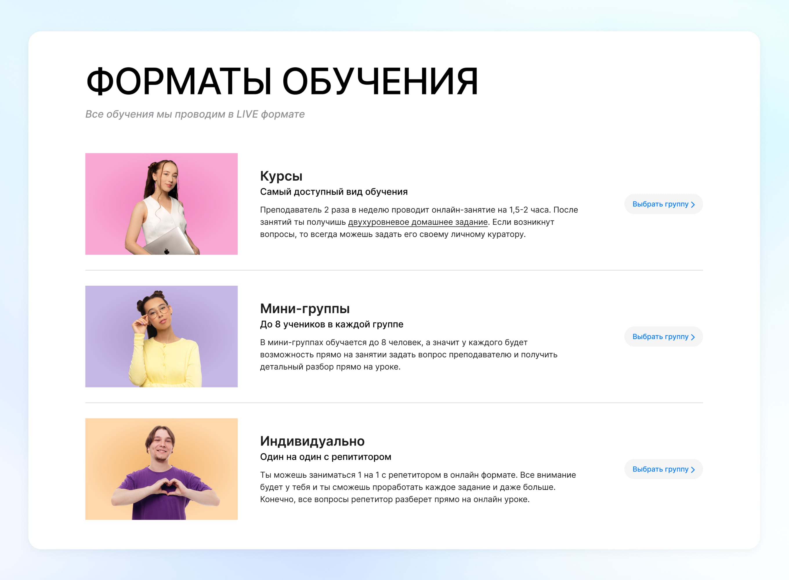 В данном блоке показываем какие есть форматы обучения с коротким и понятным описанием.