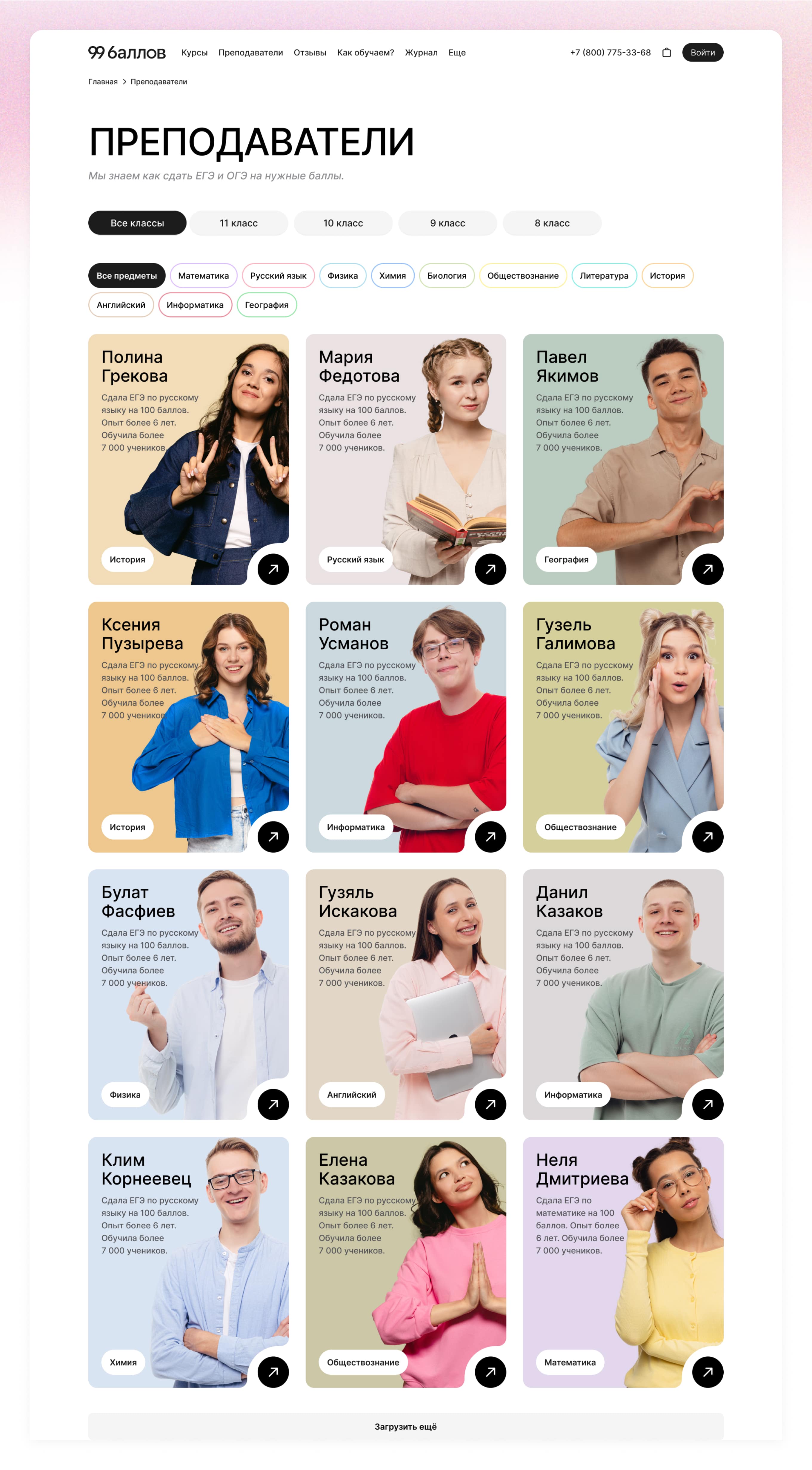 Страница всех преподавателей – одна из самых важных страниц сайта. Нам было важно показать, что 99 баллов – инновационная школа и страница должна выглядеть ярко и стильно.