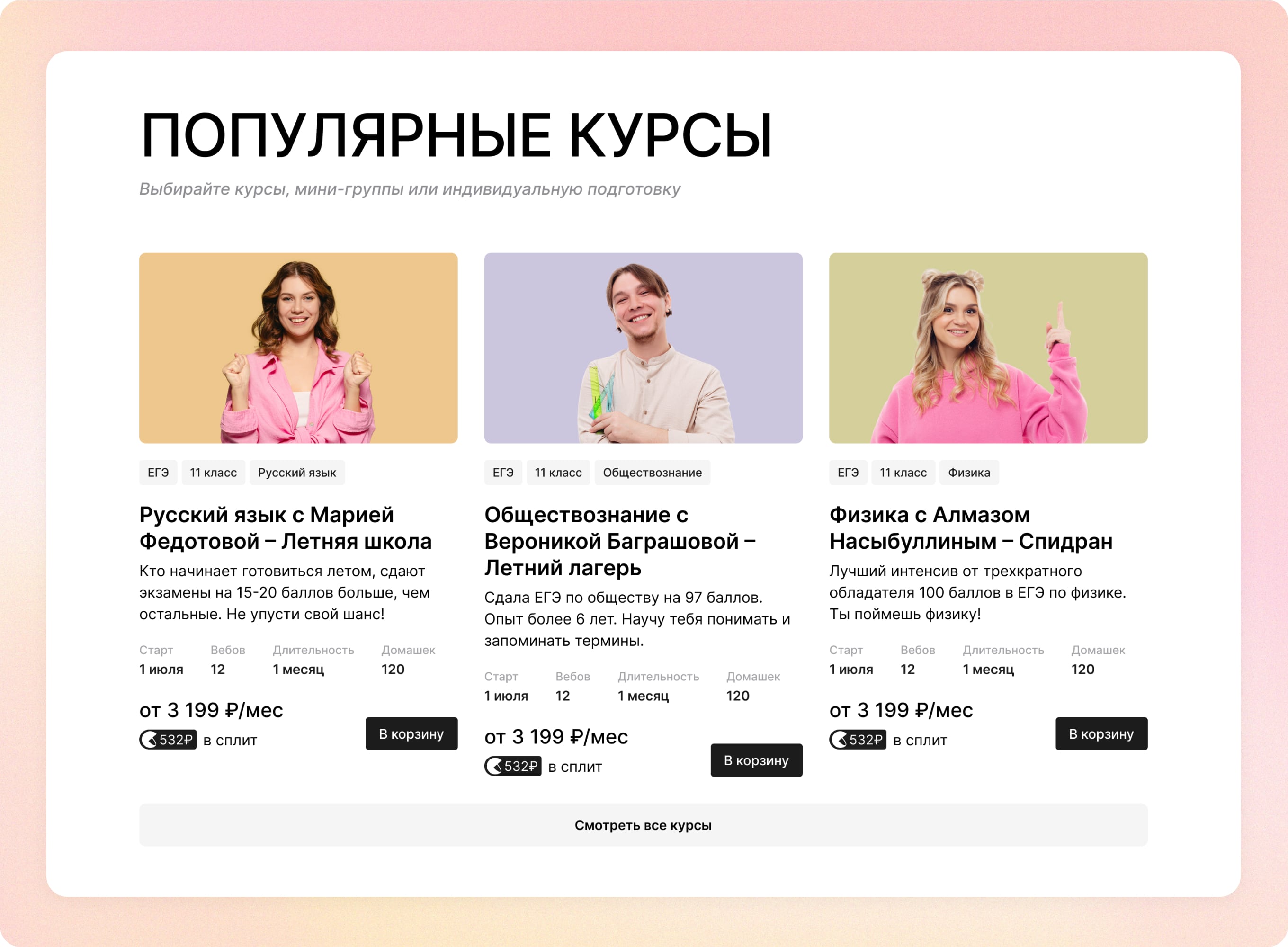 В данном блоке показываем популярные курсы. Можно сразу добавить в корзину или перейти на страницу курса. Также можно перейти на страницу всех курсов.