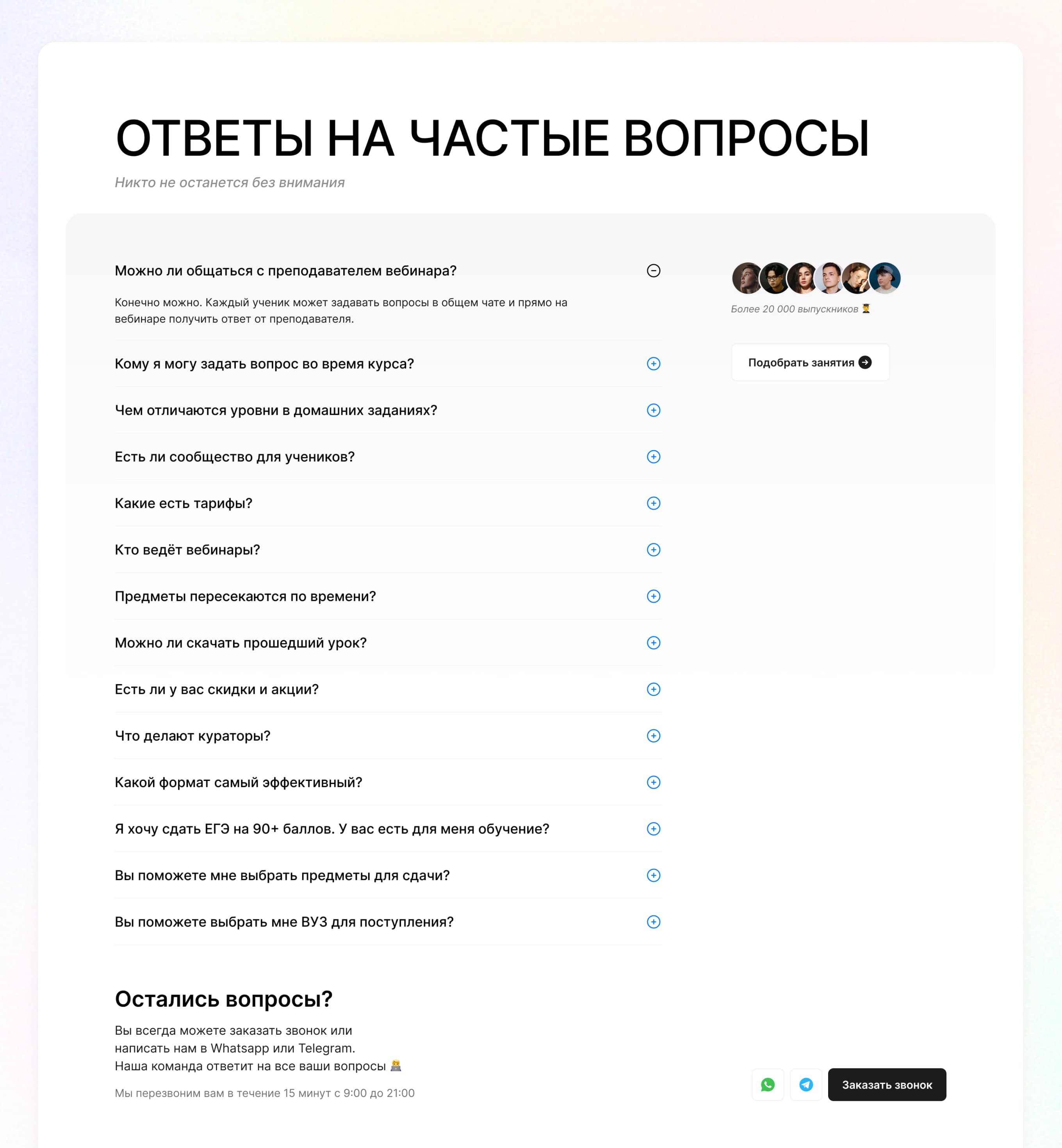 Последний блок – ответы на частые вопросы. Здесь клиент получает ответ на интересующий его вопрос. Отсюда же клиент может заказать звонок или перейти в мессенджер.