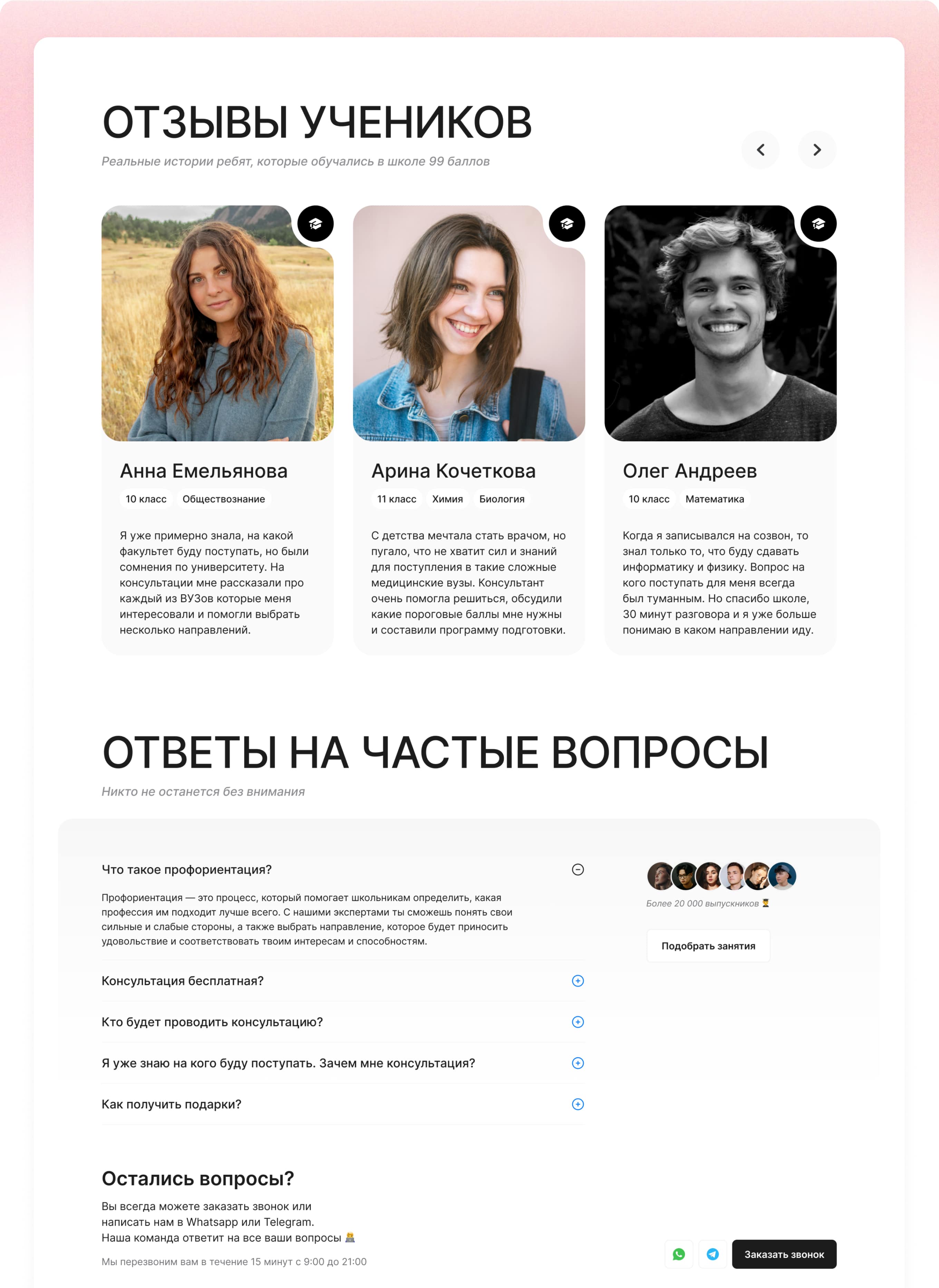 Там же показываем отзывы о консультации и ответы на частые вопросы.