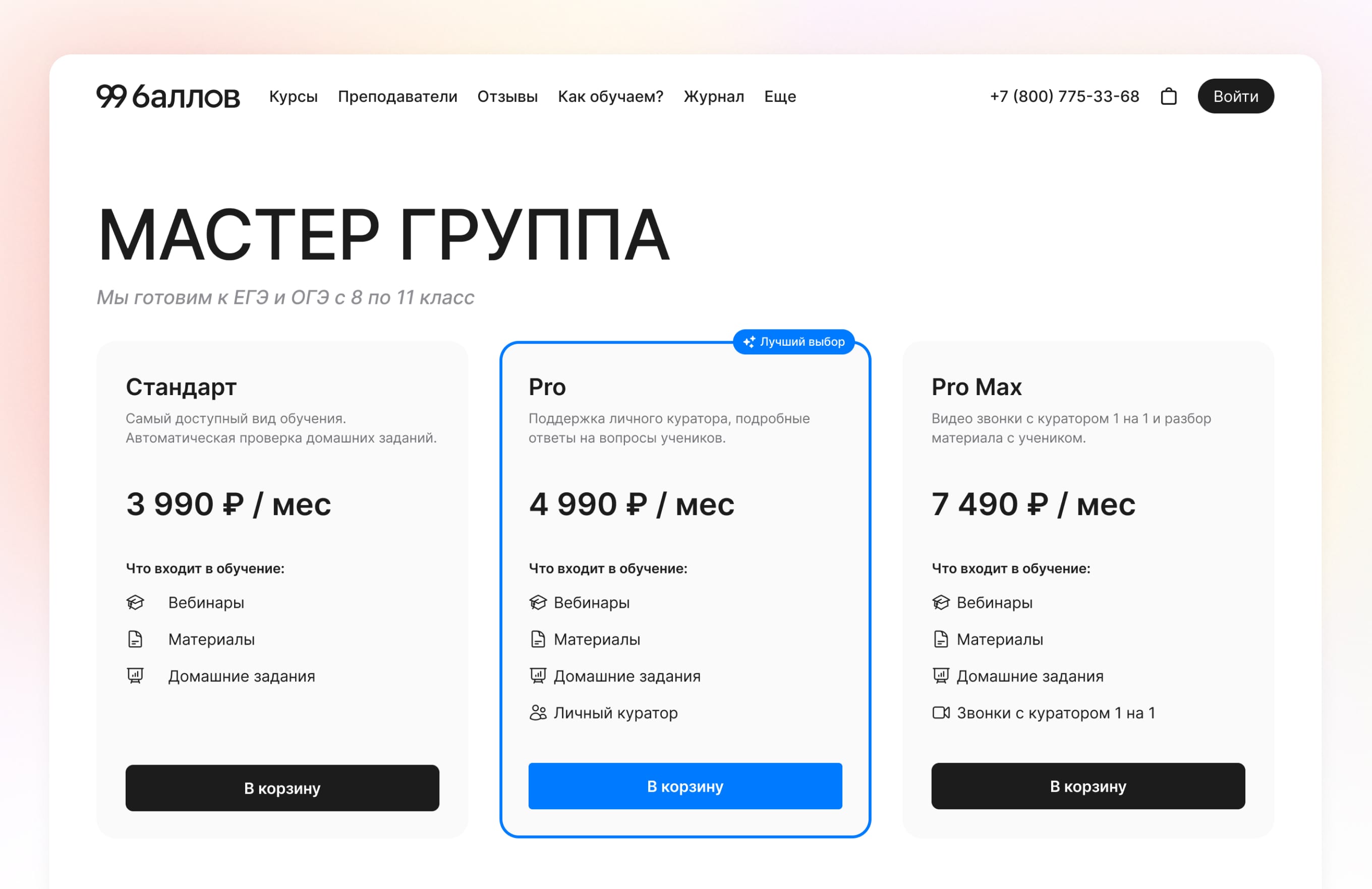 Мастер группа – тарифы обучения по разным ценам и с разными наборами. Можно добавить сразу в корзину и перейти к оформлению.
