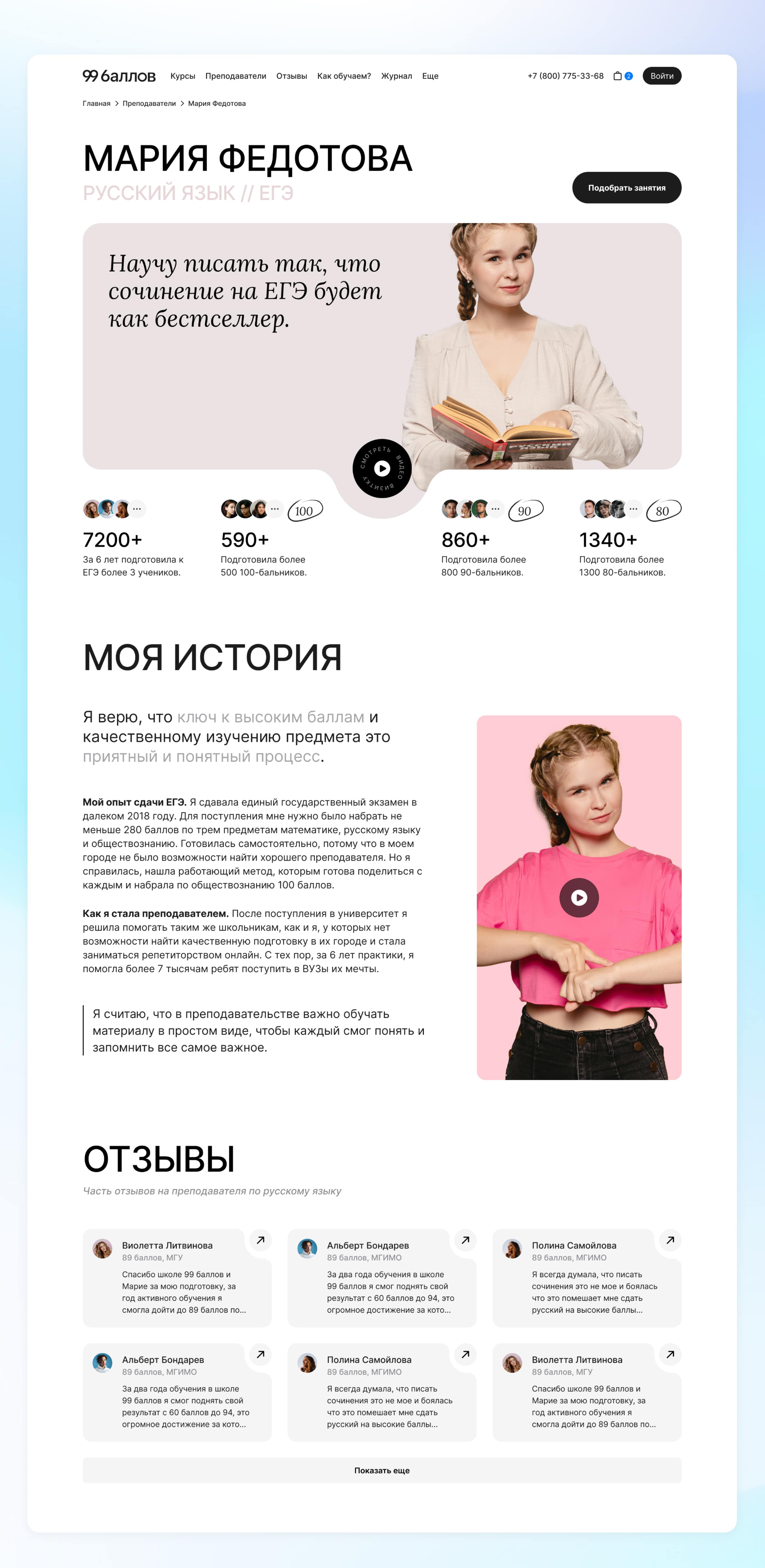 На странице преподавателя и показываем историю. Это важный блок, чтобы клиент понимал, кто будет его учить. Тут же мы показываем реальные отзывы от учеников школы.