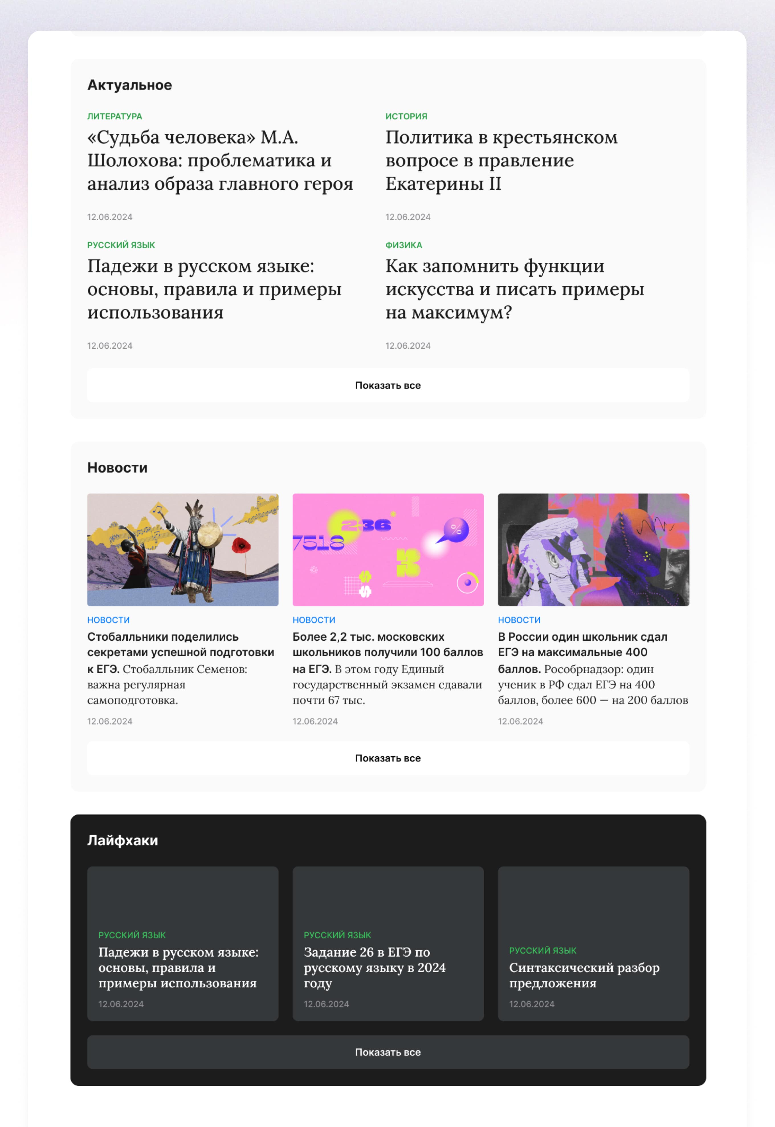 Мы создали отдельный блоки для разделов, чтобы можно было быстрее перейти к нужной статье, которая зацепит внимание.