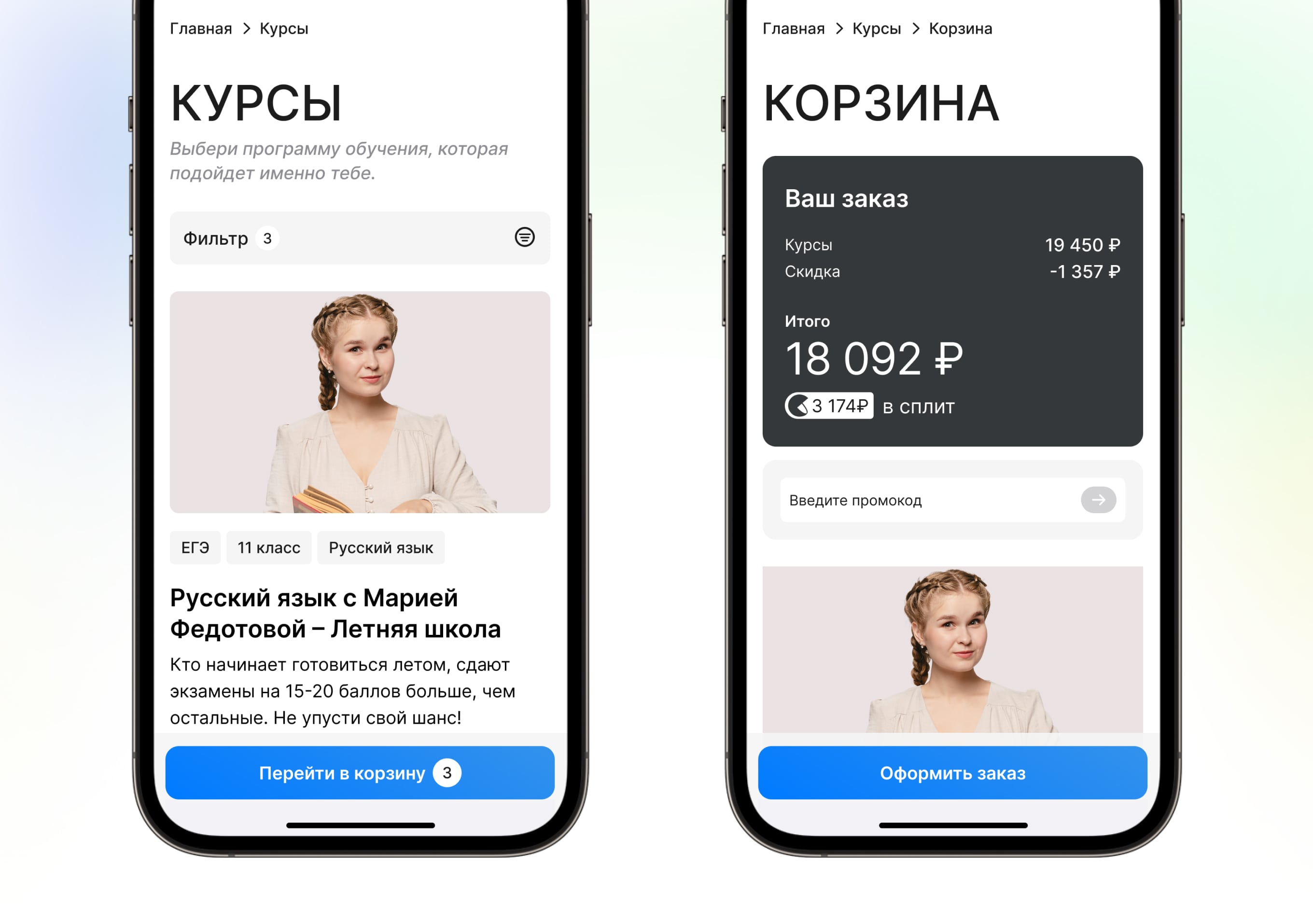 Обратите внимание, что самая важная кнопка находится снизу, чтобы клиенту было удобно перейти в Корзину. Фильтр перенесли наверх для быстрого доступа. В корзине же сразу показываем общую сумму добавленных курсов и оформить заказ.