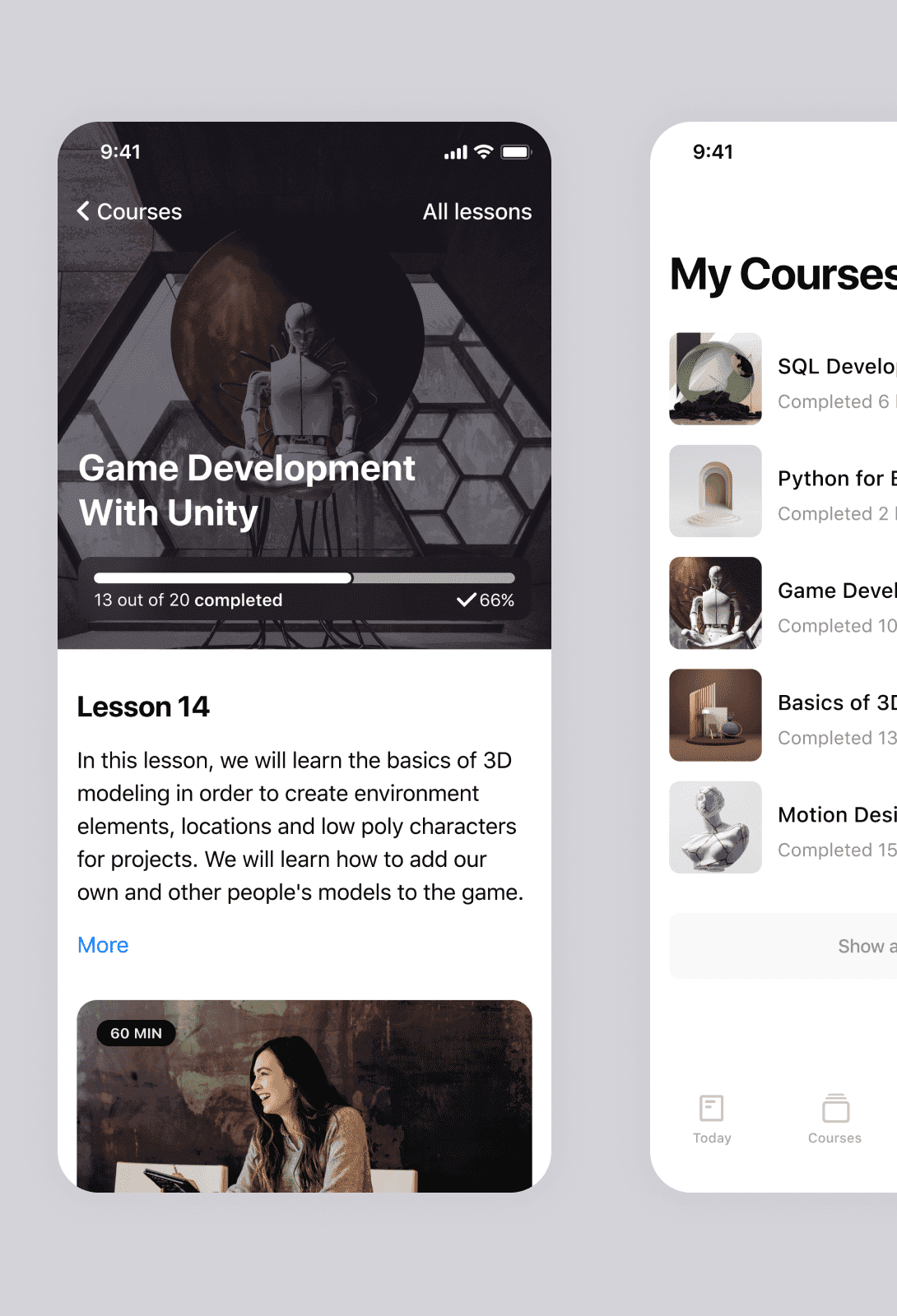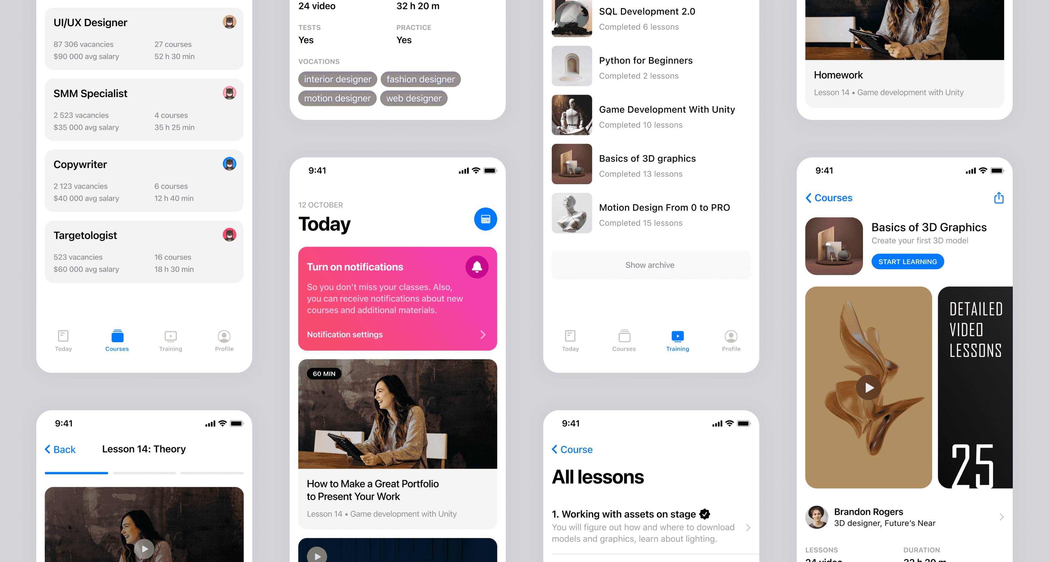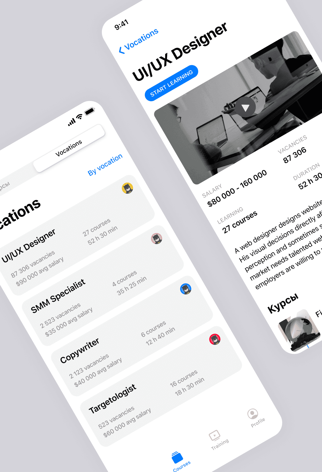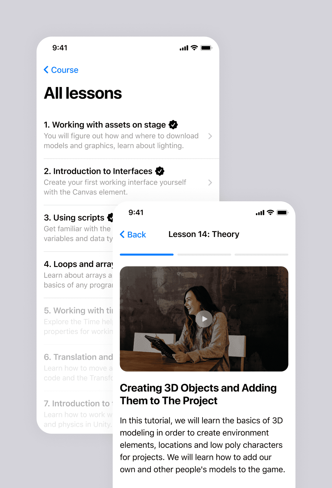 После оплаты пользователю доступны уроки. Уроки сгруппированы в блоки для более удобного прохождения. Также клиент может отслеживать свое прохождение и прогресс. После каждого урока можно пройти тест и проверить свои знания.