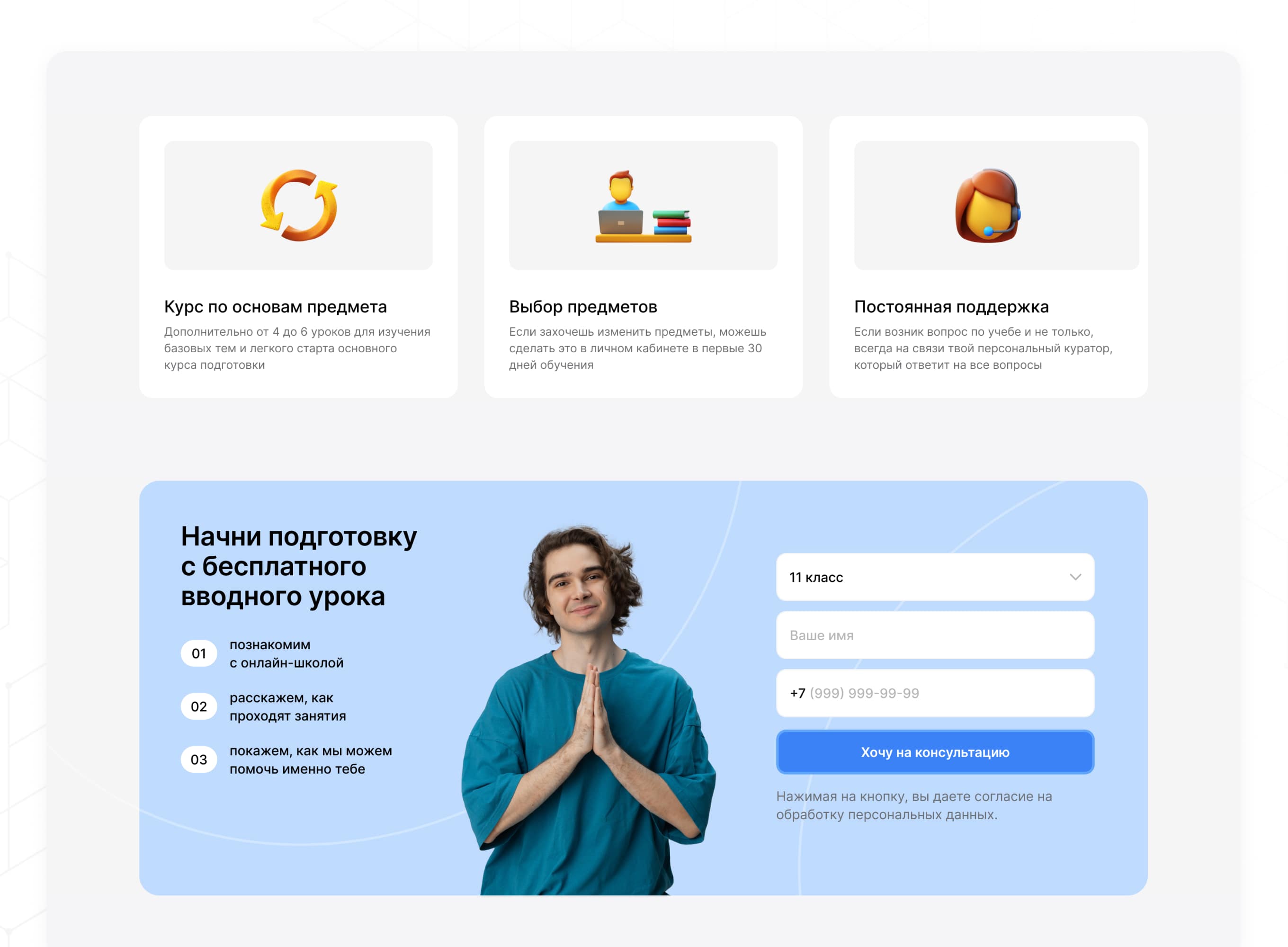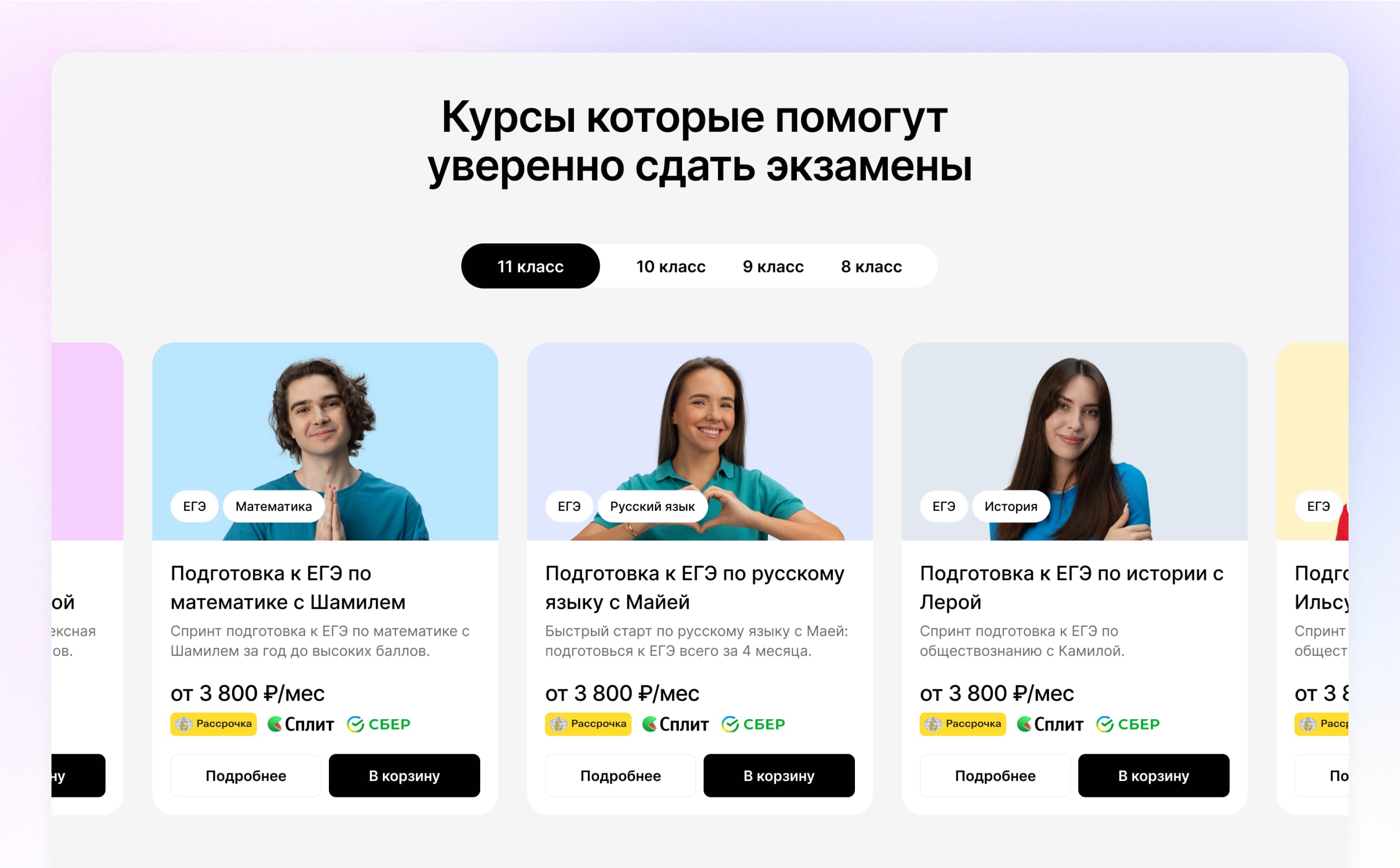 На данной странице клиент может выбрать пакет с курсами, выбрать преподавателей, тариф, оплатить и сразу начать обучение.