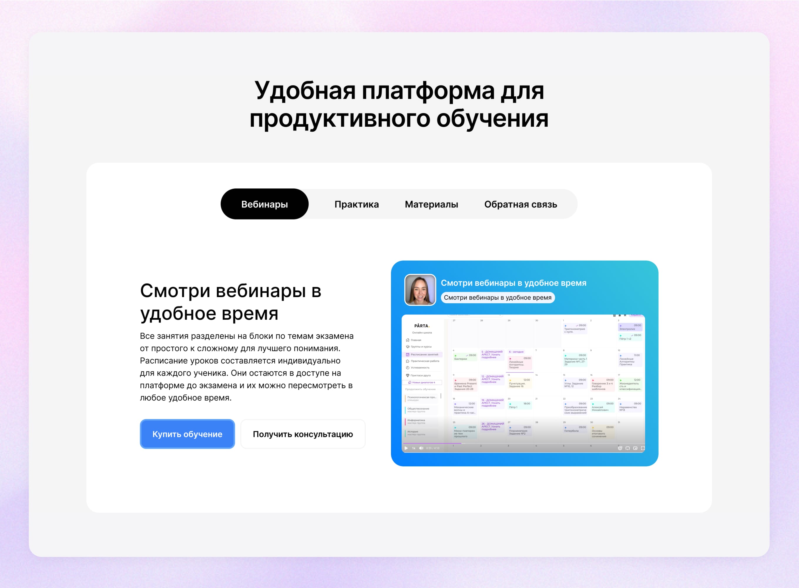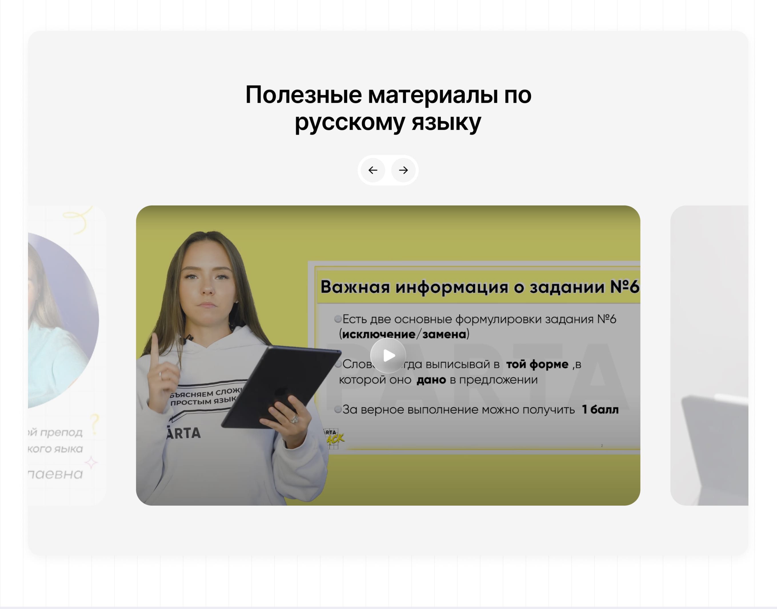 Также показываем видео преподавателя в слайдере, чтобы клиенты сразу видели как понятно и подробно доносится материал.