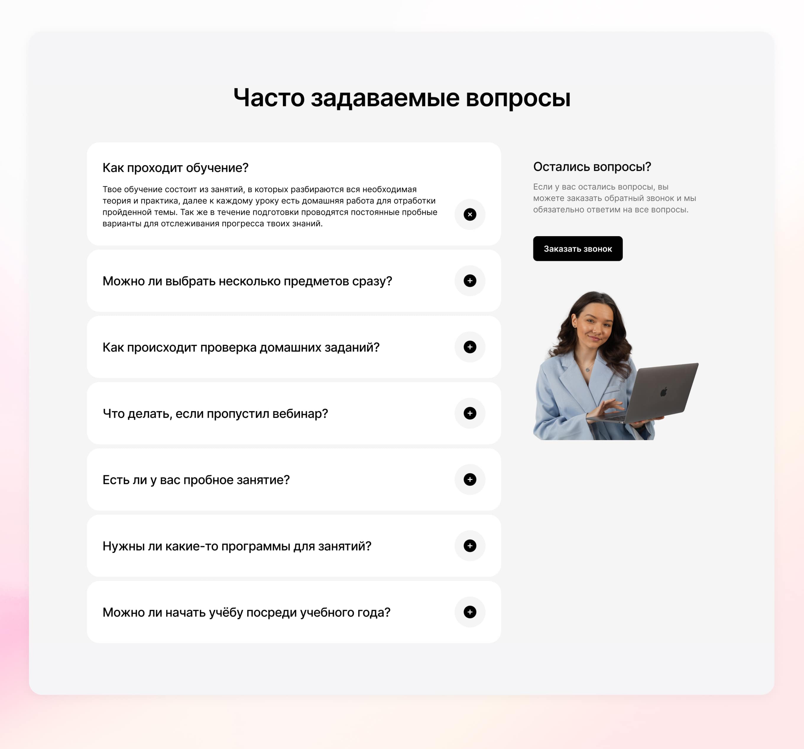 Частые вопросы, которые могут возникнут у ученика или их родителей. Важно дать ответ сразу, если у клиента есть какие-либо вопросы.