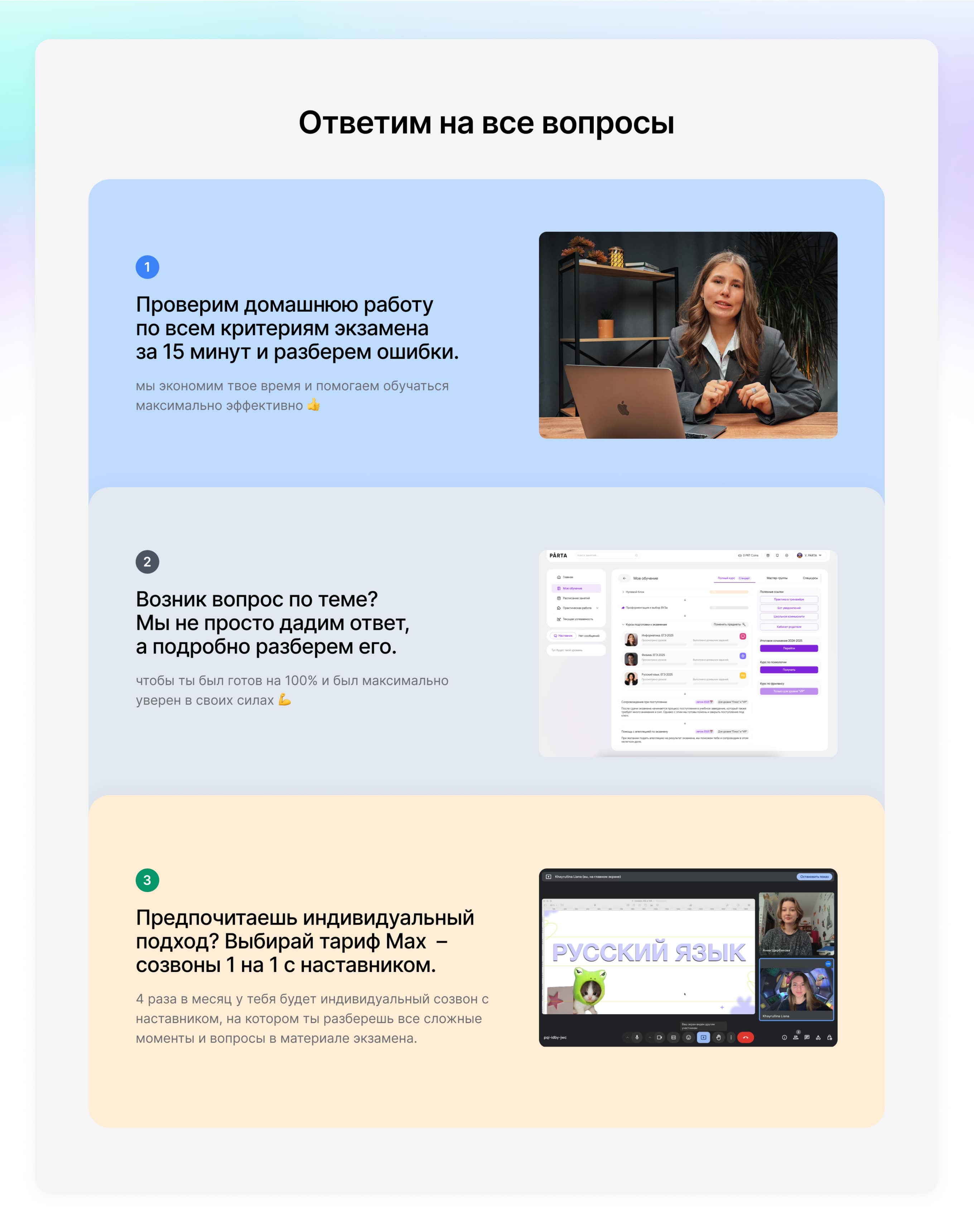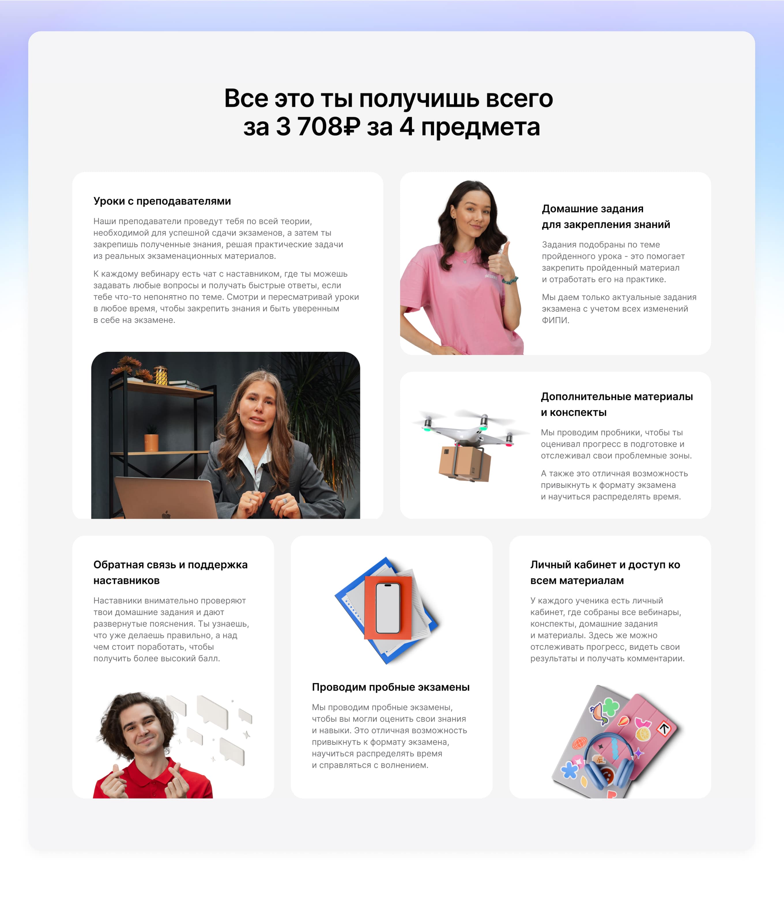 В данном блоке показываем, что ученик получит после оплаты. Важный блок, чтобы показать, что ценность курса намного выше цены за обучение.