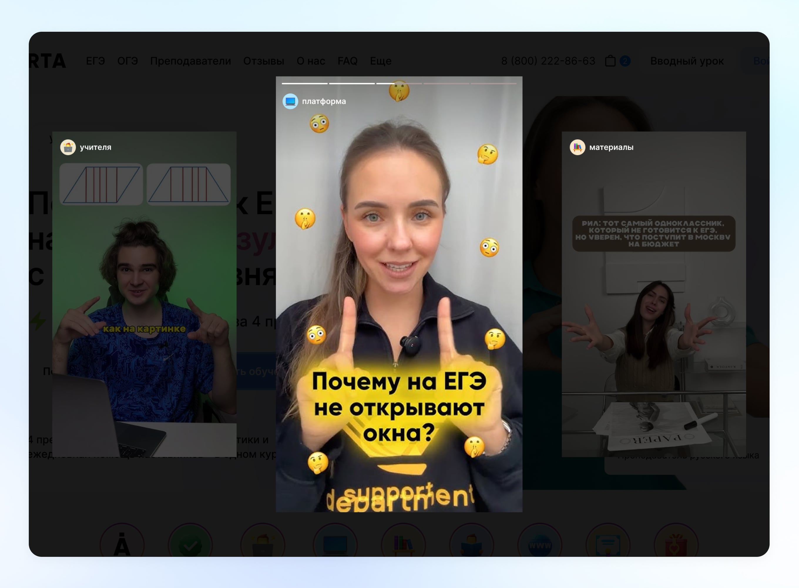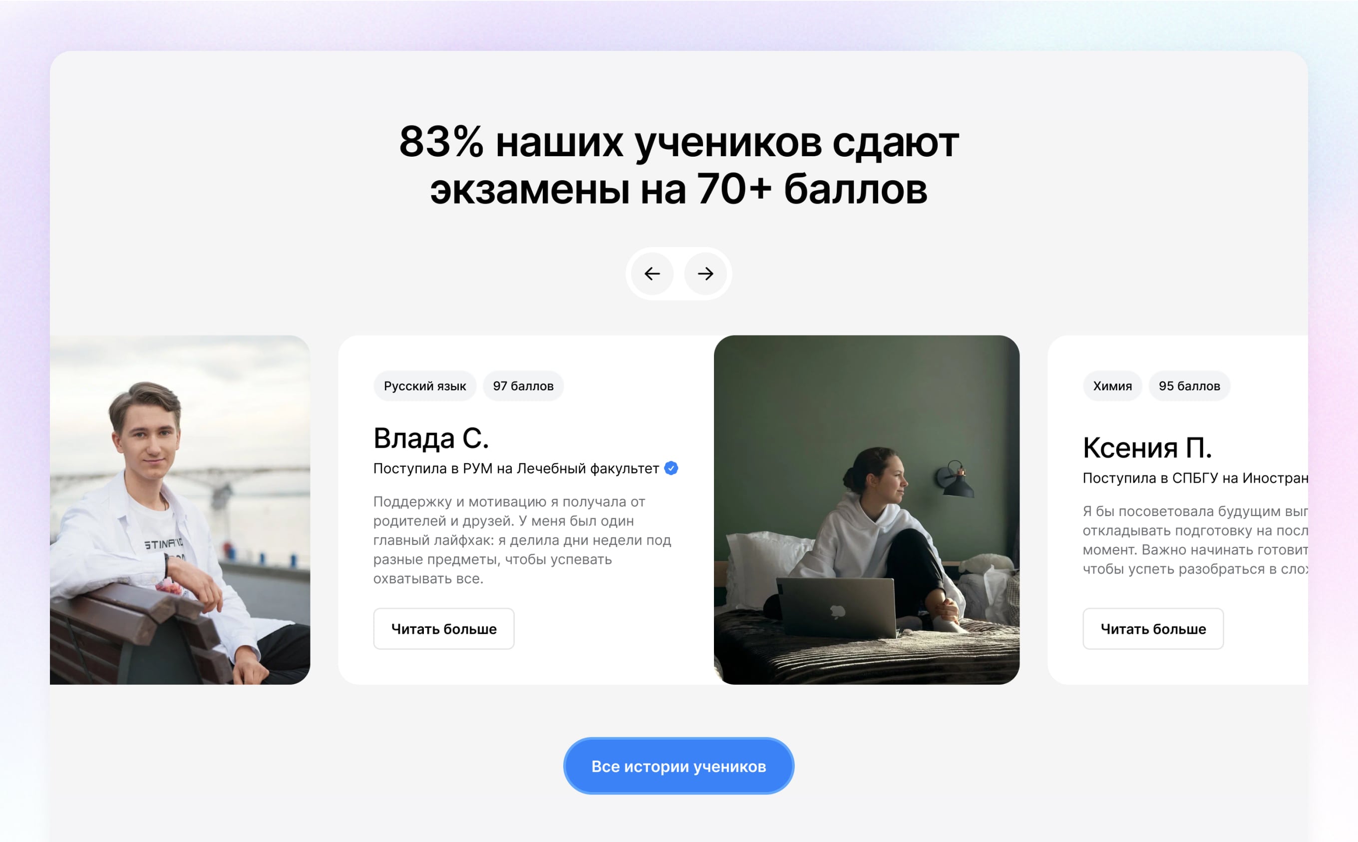 Реальные кейсы и отзывы учеников школы – важная составляющая сайта. Ученикам важно видеть, что сдать ЕГЭ и ОГЭ на высокие баллы – это реально и с упорным трудом все получится!