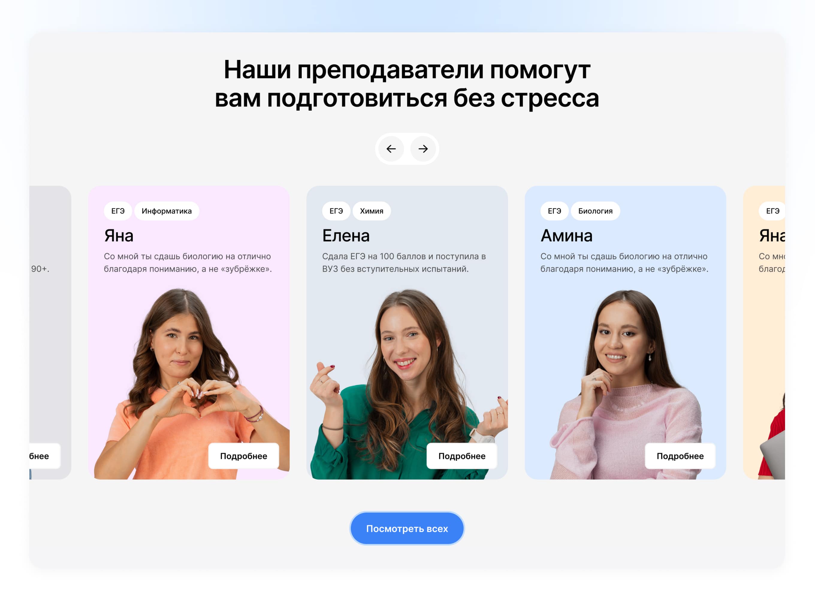 Слайдер с преподавателями с бесконечным переключением. У каждого преподавателя свой фон, тег и описание. Можно посмотреть всех учителей или открыть страницу одного преподавателя с подброной информации.