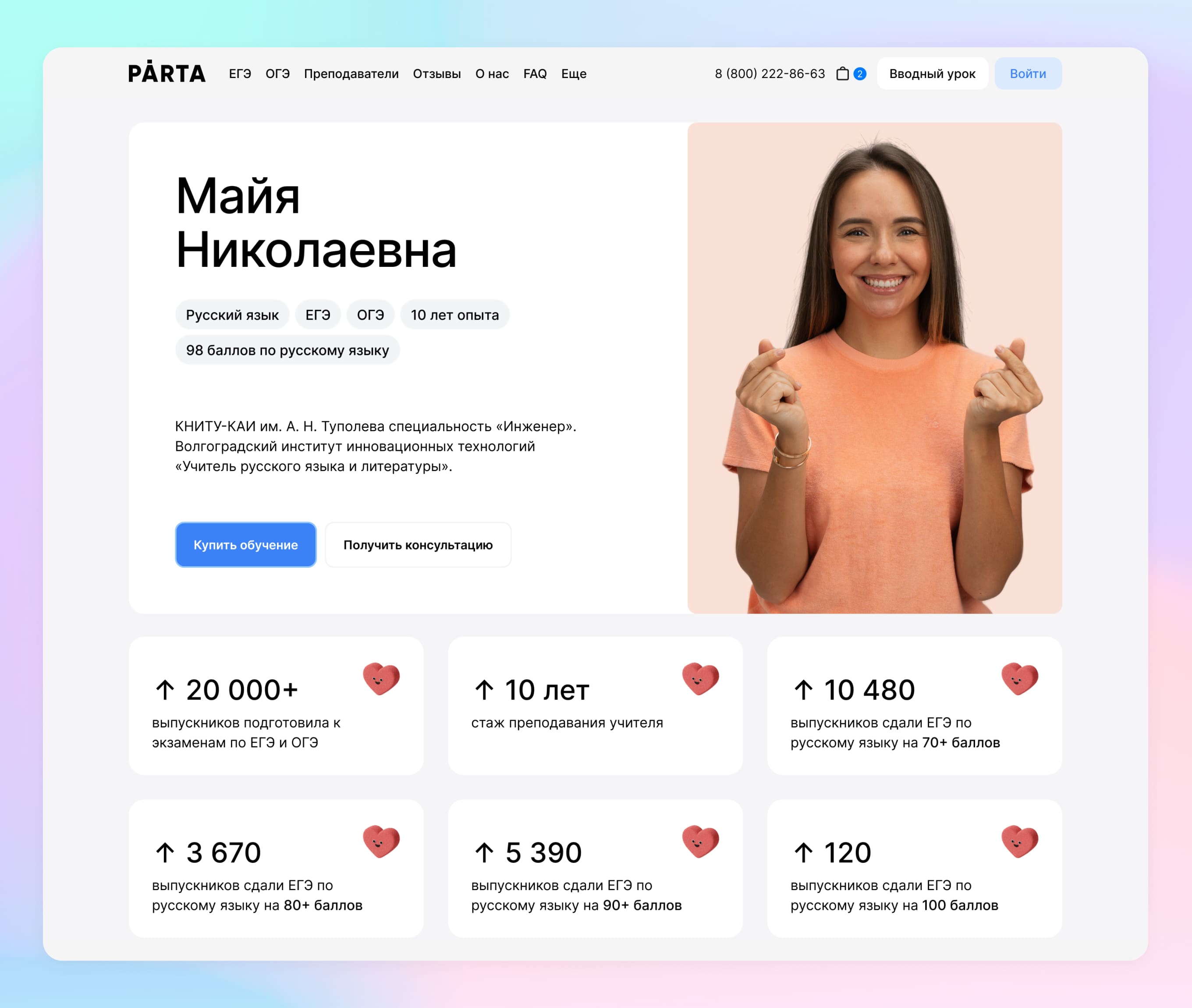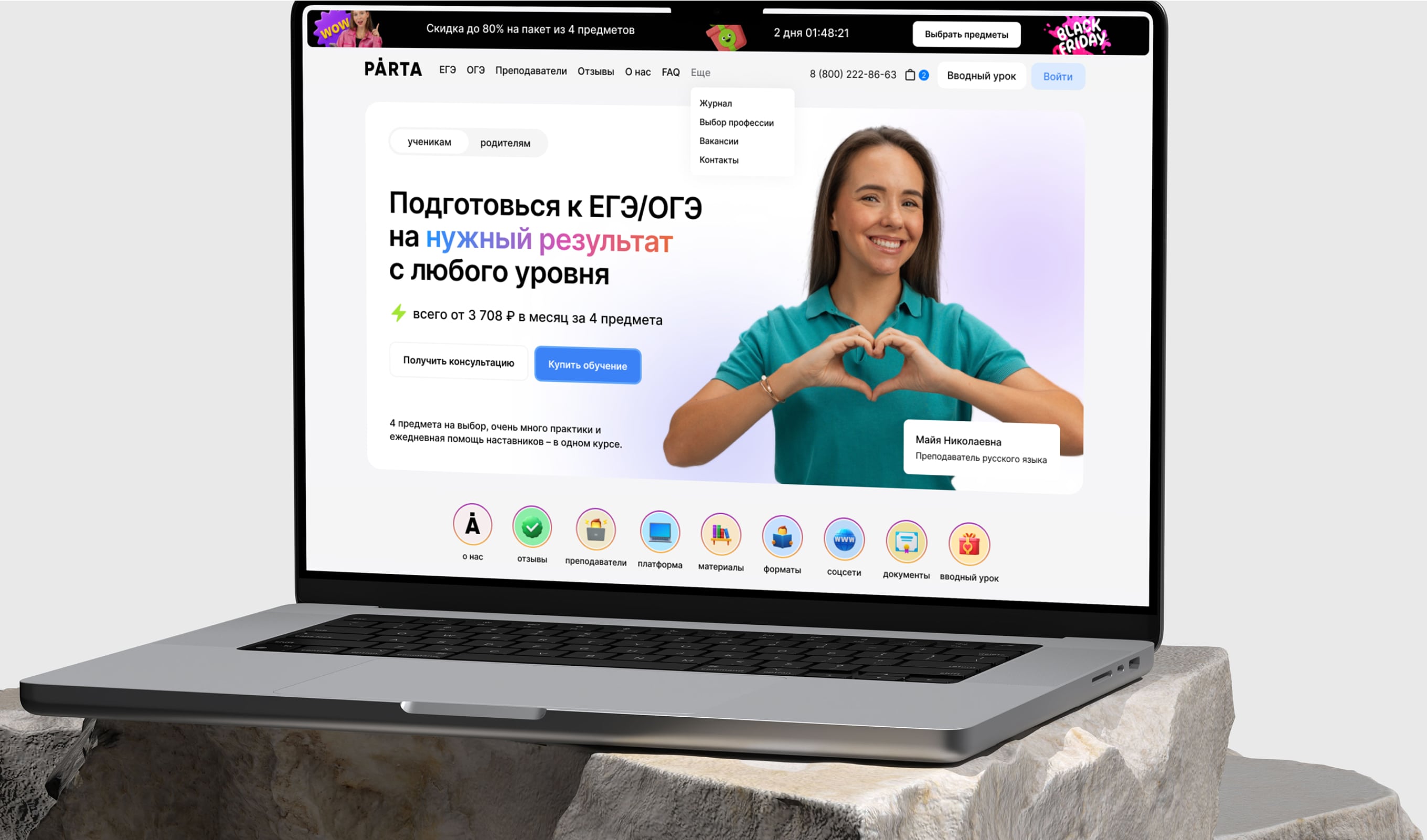 Parta – современная школа, которая стояла у истоков онлайн образования в сфере подготовки к ЕГЭ и ОГЭ в России. Для нас было честью разработать современный сайт, в которой школьники всей страны хотели бы учиться и влюбиться в школу с первого взгляда.