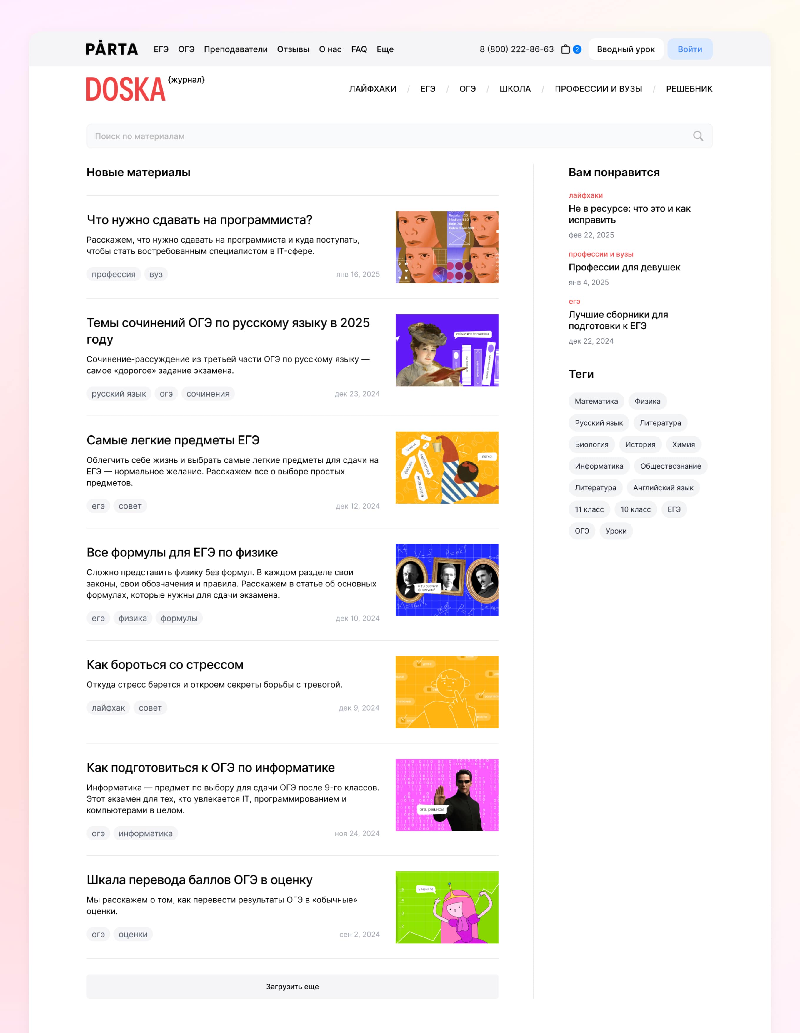 Мы также разработали дизайн Журнала под названием Doska. Здесь школа будет добавлять статьи и полезные материалы для школьников. Также это дополнительный источник трафика из поиска.